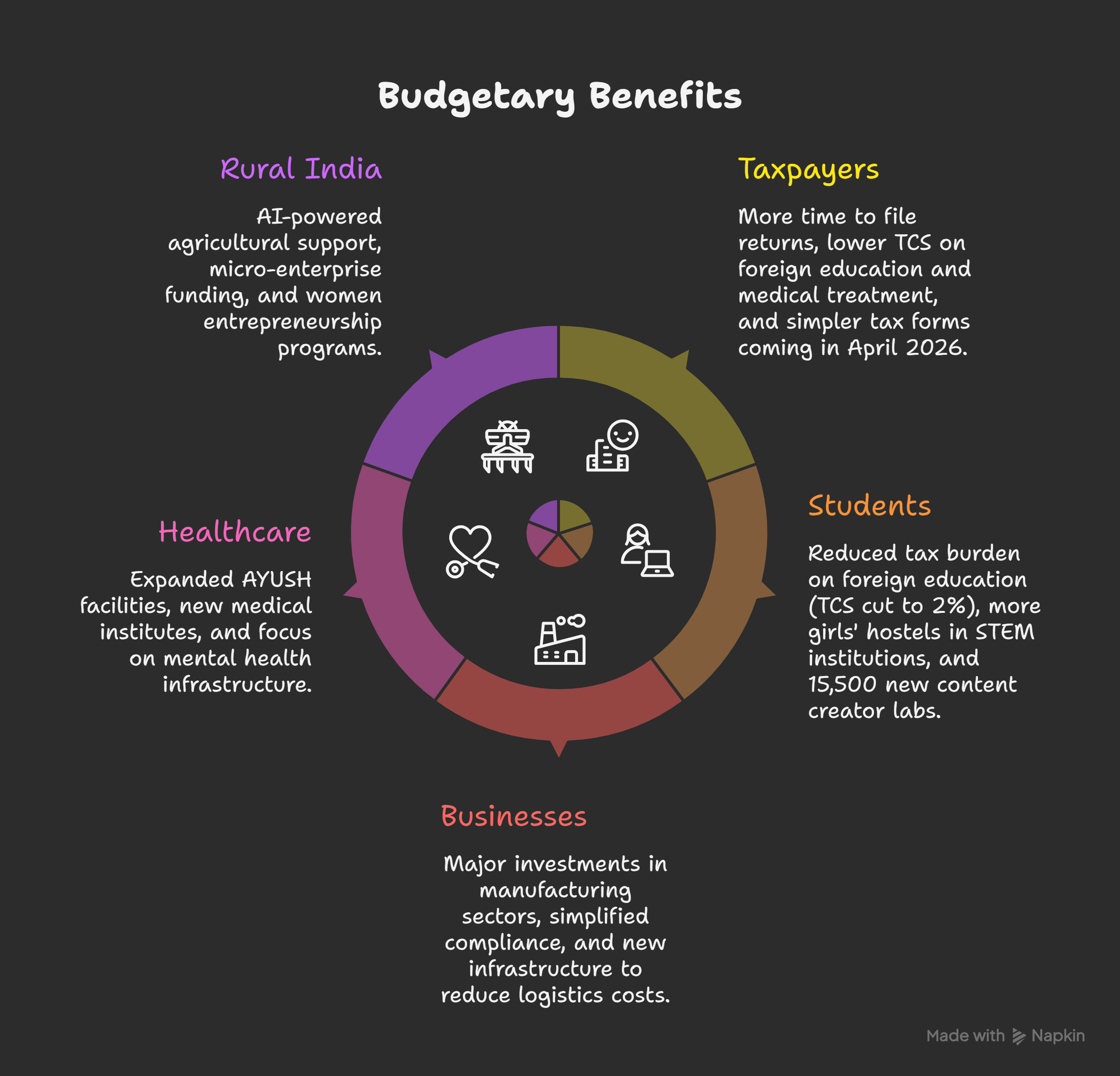- For Healthcare: Expanded AYUSH facilities, new medical institutes, and focus on mental health infrastructure.